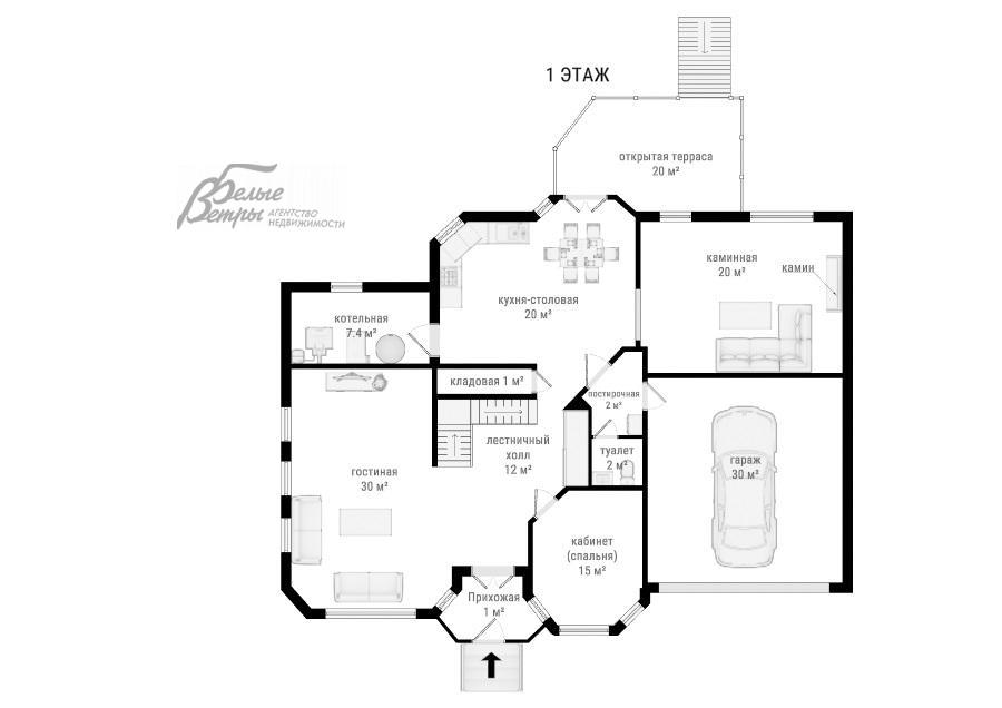 1-ый этаж: прихожая 1 кв.м, гостиная со вторым светом 30 кв.м, спальня (кабинет) 15 кв.м, лестничный холл 12 кв.м, санузел гостевой 2 кв.м, постирочная 2 кв.м, кухня-столовая 20 кв.м, котельная 7.4 кв.м, комната с камином 20 кв.м, кладовая 1 кв.м, открытая терраса 20 кв.м, гараж 30 кв.м
