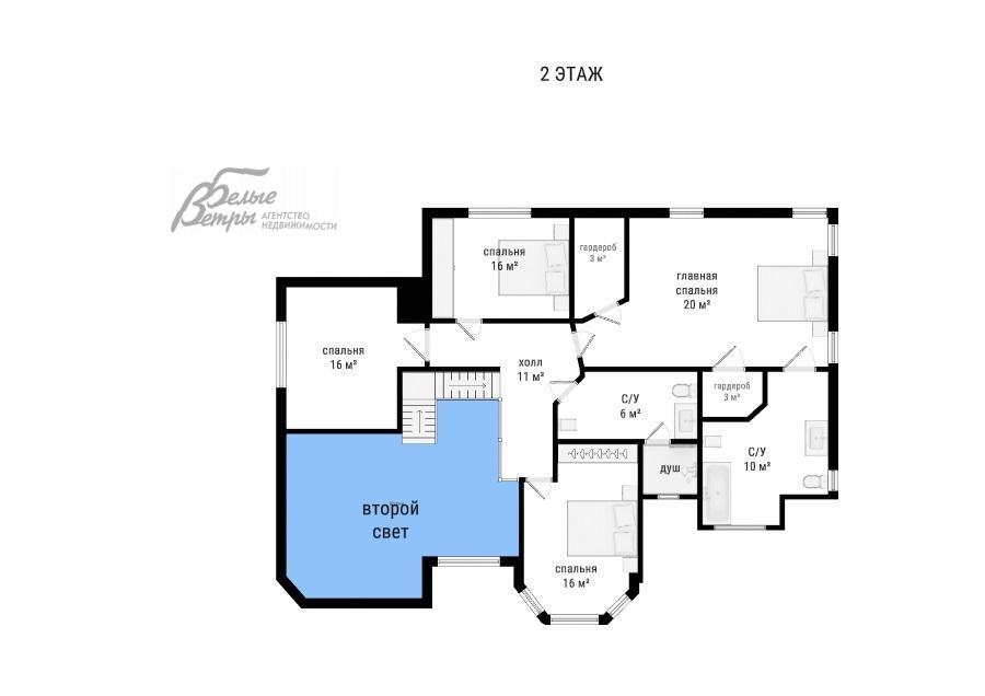2-ой этаж: холл 11 кв.м, мастер-спальня 20 кв.м с двумя гардеробными по 3 кв.м и санузлом с ванной 10 кв.м, спальня 16 кв.м, спальня детская 16 кв.м, спальня гостевая 16 кв.м, санузел с душевой 6 кв.м