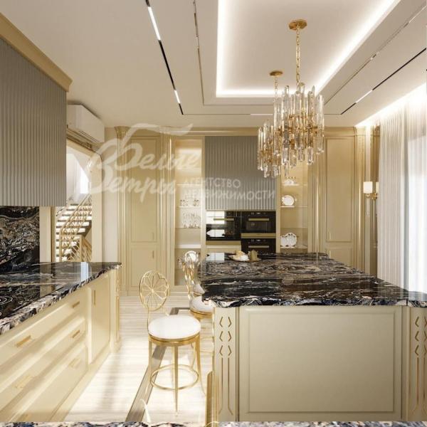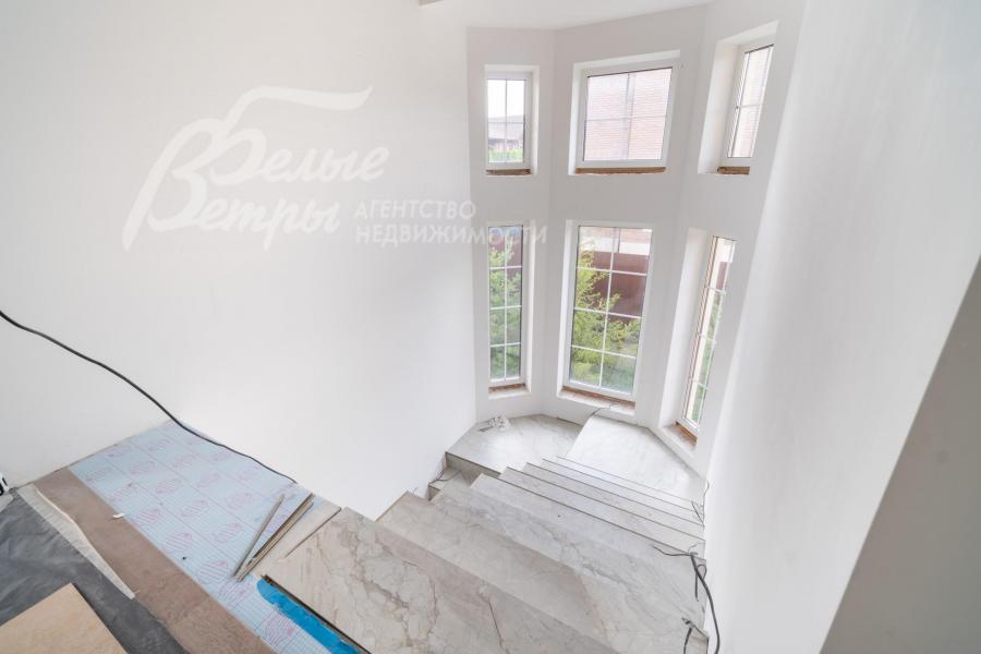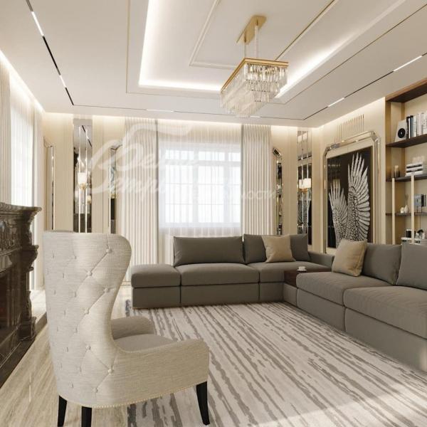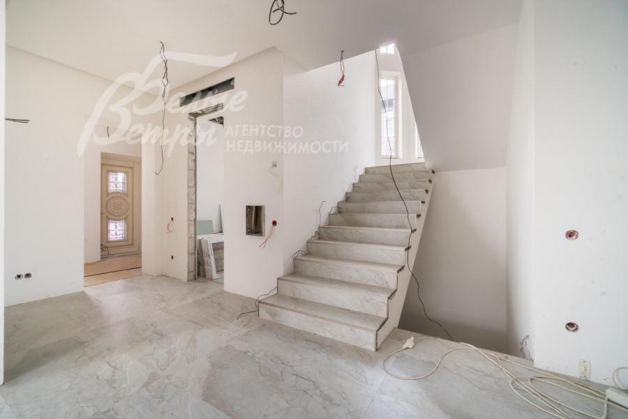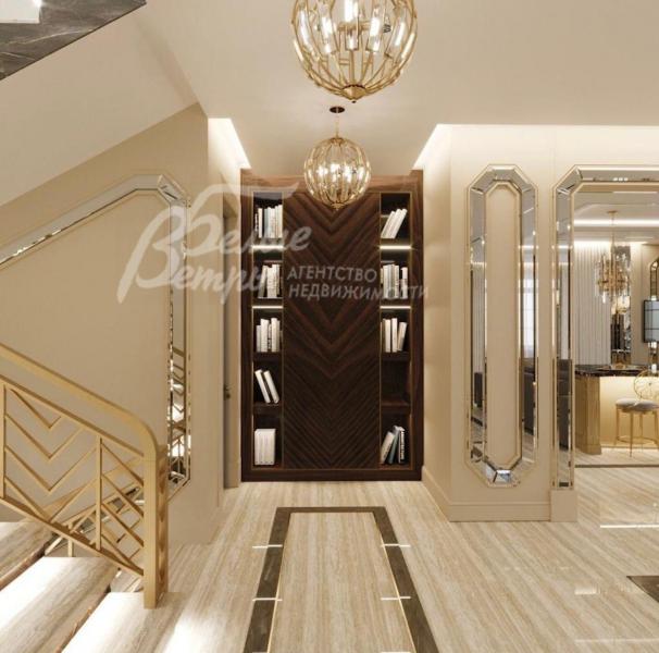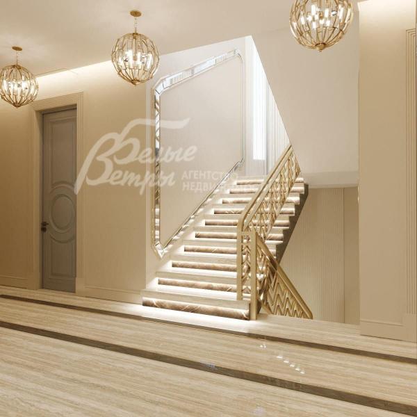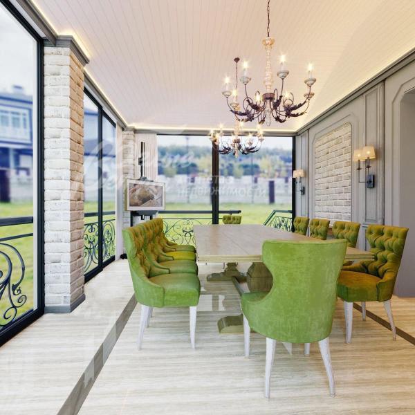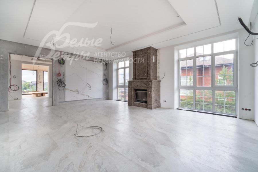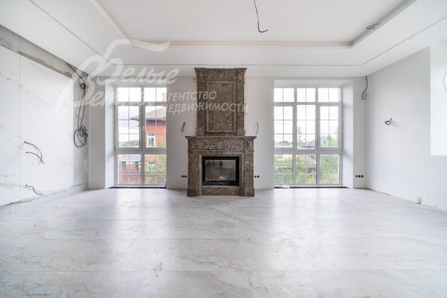 Описание внутренней отделки: выполнена отделка под финиш в соответствии с актуальными трендами дизайна интерьера. Стены в общих помещениях на 1-м этаже подготовлены под покраску, в спальнях поклеены обои, в санузлах – керамогранит и плитка. На полу – плитка с тёплым полом (в общих помещениях на 1-м этаже и в санузлах), в спальнях – ламинат. Потолки из гипсокартона, многоуровневые с подсветкой (в зимнем саду потолки деревянные). Установлены межкомнатные двери на 2-м этаже высотой 2,4 м (серого цвета), стильная входная дверь с терморазрывом (зелёного цвета с золотой патиной и двумя стеклянными секциями), стальные радиаторы Buderus, подрозетники. На второй этаж ведёт монолитная бетонная лестница со ступенями из керамогранита (имитация дуба). Гостиную украшает эффектный камин с порталом в классическом стиле от пола до потолка, отделанным коричневым мрамором. В гараже – автоматические ворота