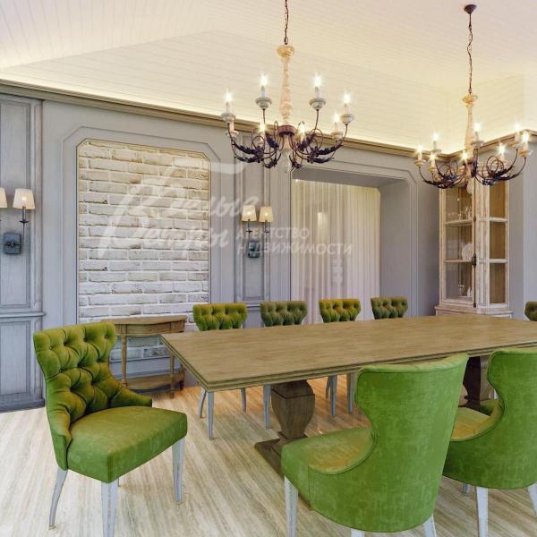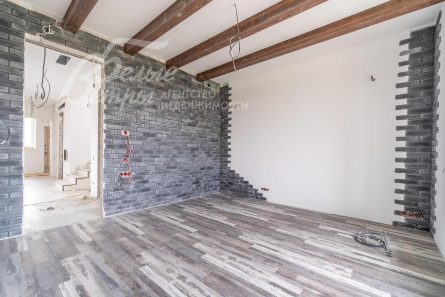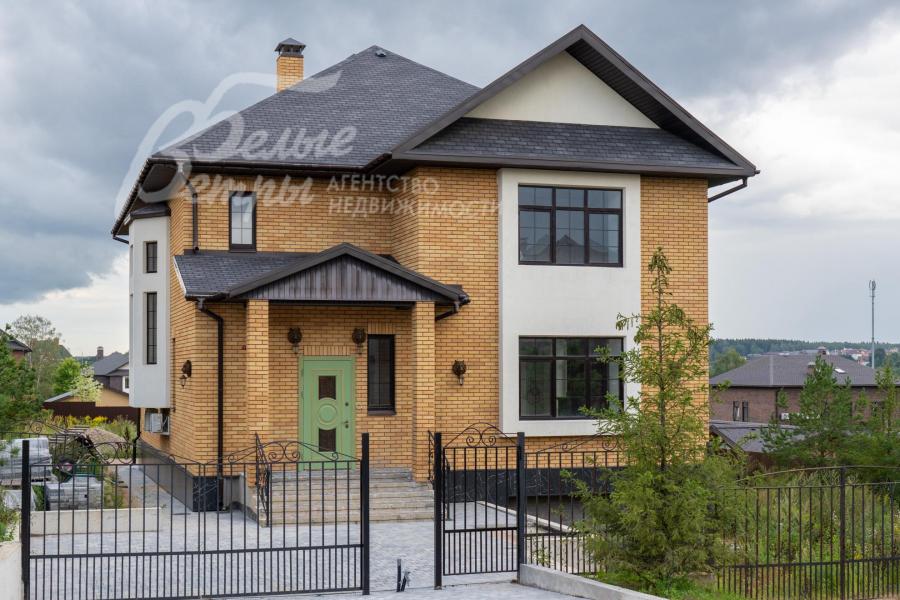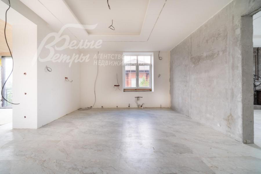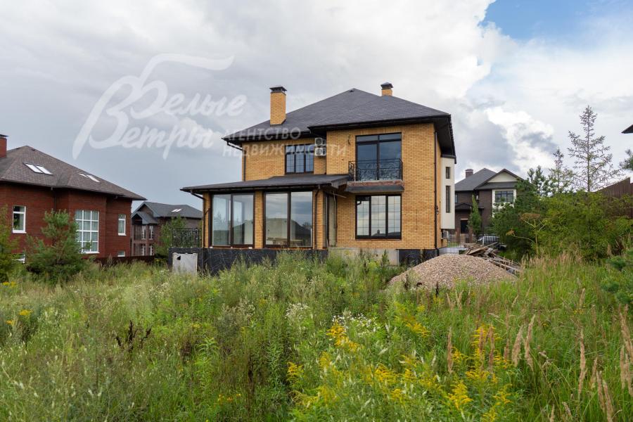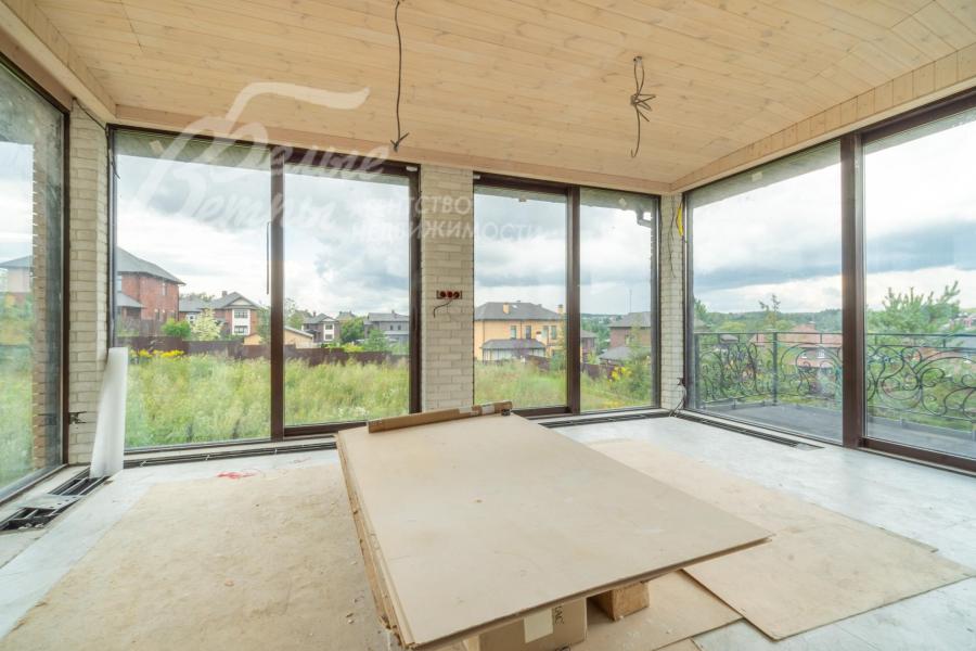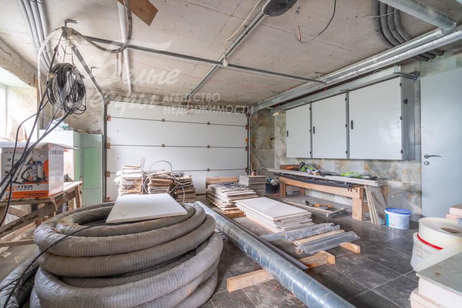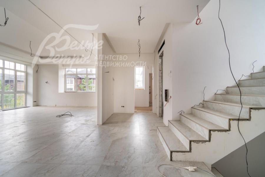 Описание внутренней отделки: выполнена отделка под финиш в соответствии с актуальными трендами дизайна интерьера. Стены в общих помещениях на 1-м этаже подготовлены под покраску, в спальнях поклеены обои, в санузлах – керамогранит и плитка. На полу – плитка с тёплым полом (в общих помещениях на 1-м этаже и в санузлах), в спальнях – ламинат. Потолки из гипсокартона, многоуровневые с подсветкой (в зимнем саду потолки деревянные). Установлены межкомнатные двери на 2-м этаже высотой 2,4 м (серого цвета), стильная входная дверь с терморазрывом (зелёного цвета с золотой патиной и двумя стеклянными секциями), стальные радиаторы Buderus, подрозетники. На второй этаж ведёт монолитная бетонная лестница со ступенями из керамогранита (имитация дуба). Гостиную украшает эффектный камин с порталом в классическом стиле от пола до потолка, отделанным коричневым мрамором. В гараже – автоматические ворота