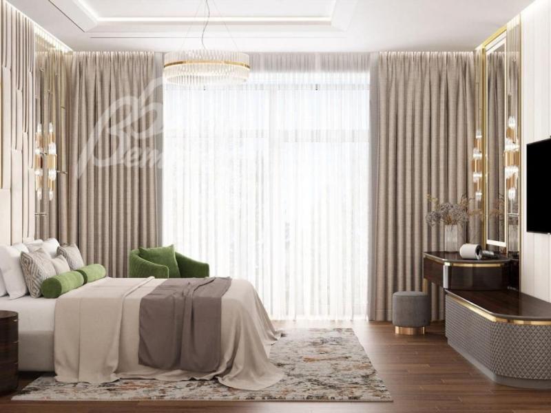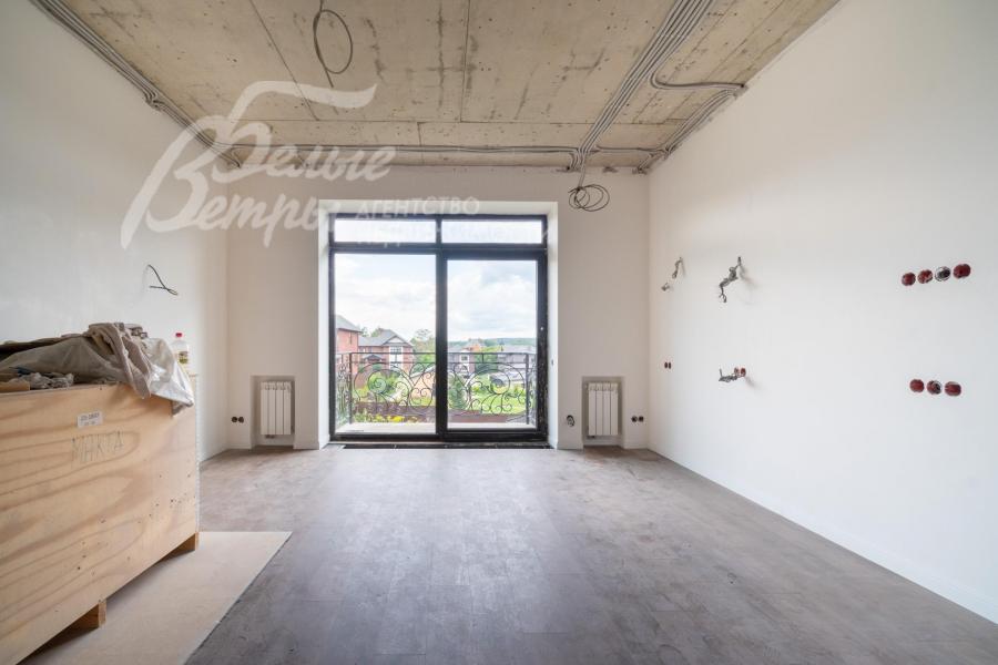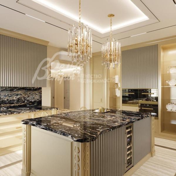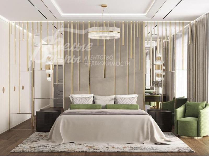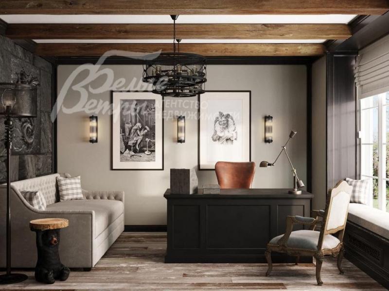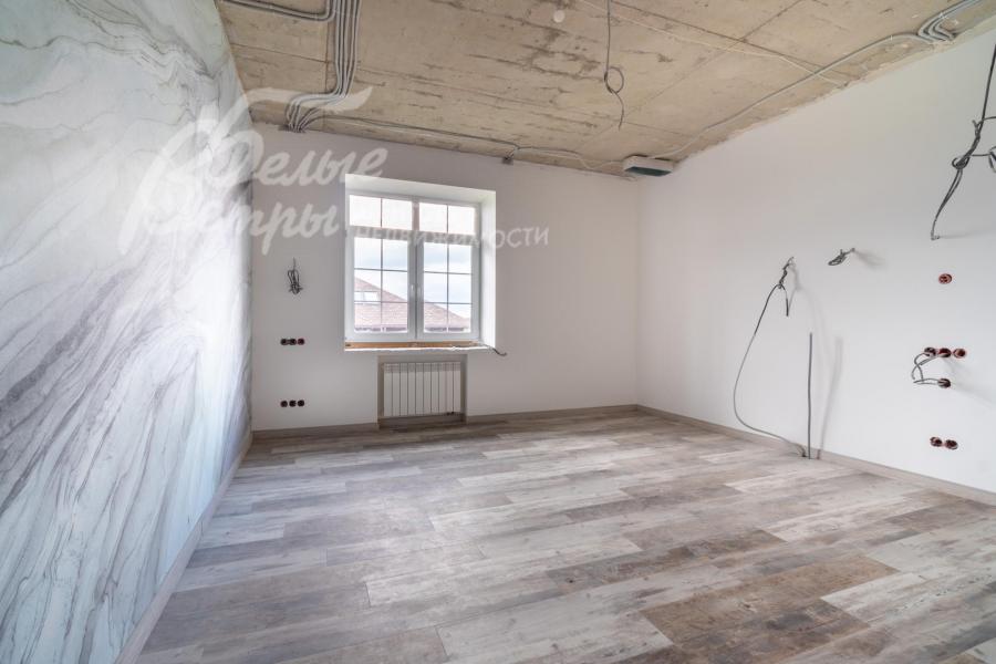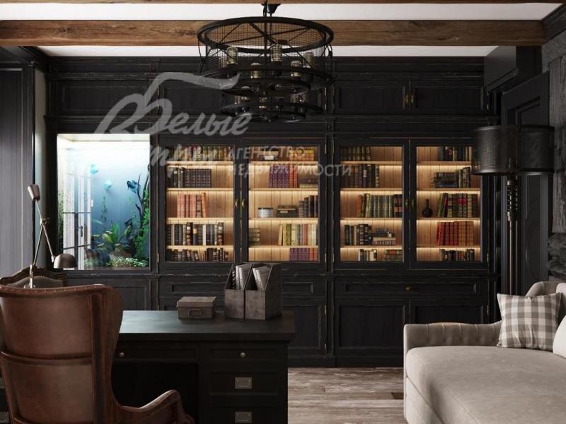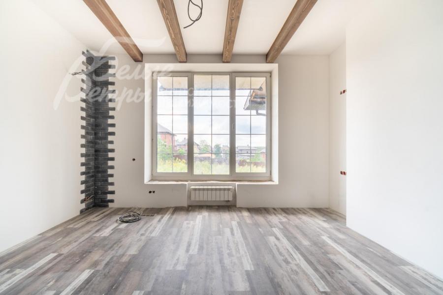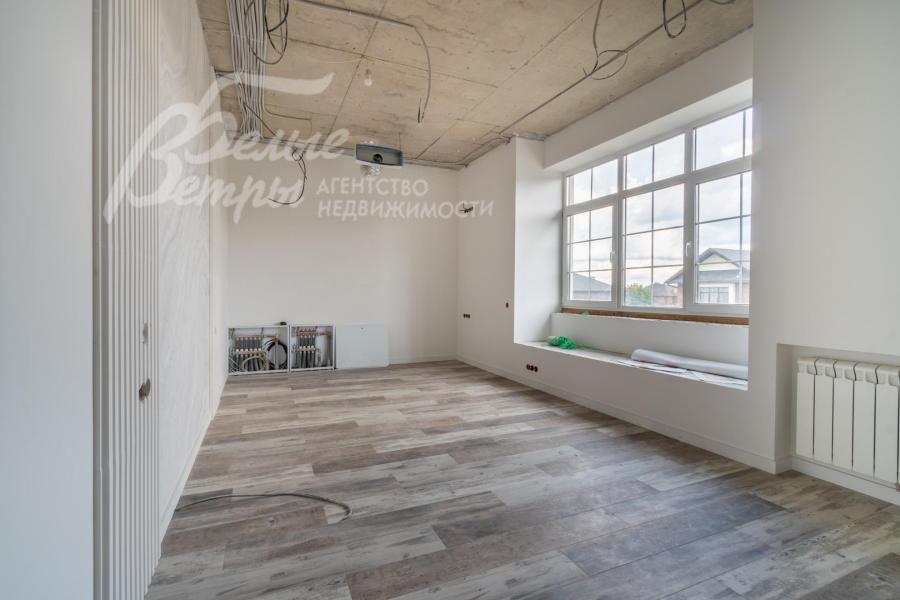 Описание внутренней отделки: выполнена отделка под финиш в соответствии с актуальными трендами дизайна интерьера. Стены в общих помещениях на 1-м этаже подготовлены под покраску, в спальнях поклеены обои, в санузлах – керамогранит и плитка. На полу – плитка с тёплым полом (в общих помещениях на 1-м этаже и в санузлах), в спальнях – ламинат. Потолки из гипсокартона, многоуровневые с подсветкой (в зимнем саду потолки деревянные). Установлены межкомнатные двери на 2-м этаже высотой 2,4 м (серого цвета), стильная входная дверь с терморазрывом (зелёного цвета с золотой патиной и двумя стеклянными секциями), стальные радиаторы Buderus, подрозетники. На второй этаж ведёт монолитная бетонная лестница со ступенями из керамогранита (имитация дуба). Гостиную украшает эффектный камин с порталом в классическом стиле от пола до потолка, отделанным коричневым мрамором. В гараже – автоматические ворота
