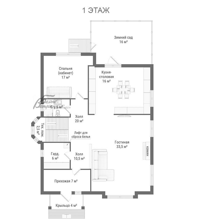 1-ый этаж: крыльцо 4 кв.м, прихожая 7 кв.м, холл 10,5 кв.м, холл 20 кв.м, гостиная 33,5 кв.м, кухня-столовая 16 кв.м с выходом в зимний сад 16 кв.м, спальня (кабинет) 17 кв.м, санузел 6 кв.м, гардеробная 6 кв.м, хозяйственное помещение 2,5 кв.м