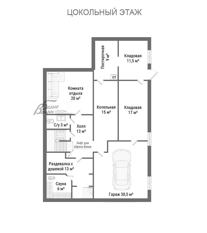 Цоколь: холл 13 кв.м, сауна 6 кв.м, раздевалка с душевой 13 кв.м, комната отдыха 20 кв.м, санузел 3 кв.м, кладовая 17 кв.м, кладовая 11,5 кв.м, постирочная 9 кв.м, котельная 15 кв.м, гараж 30,5 в.м