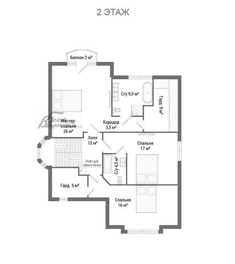 2-ой этаж: холл 13 кв.м, мастер-спальня 26 кв.м с гардеробной 9 кв.м, санузлом 9,5 кв.м, коридором 3,5 кв.м и выходом на балкон 2 кв.м, спальня 16 кв.м с гардеробной 5 кв.м, спальня 17 кв.м с санузлом 4,5 кв.м