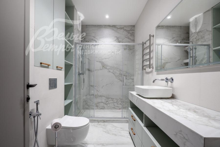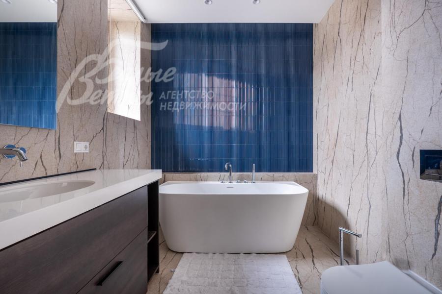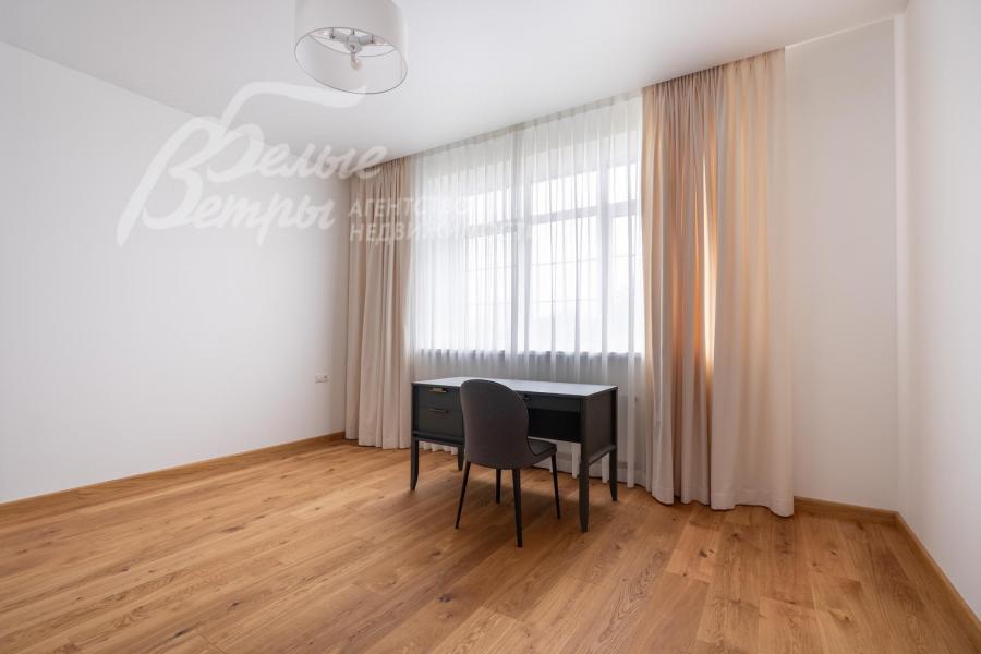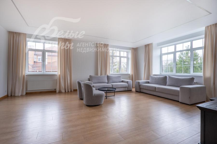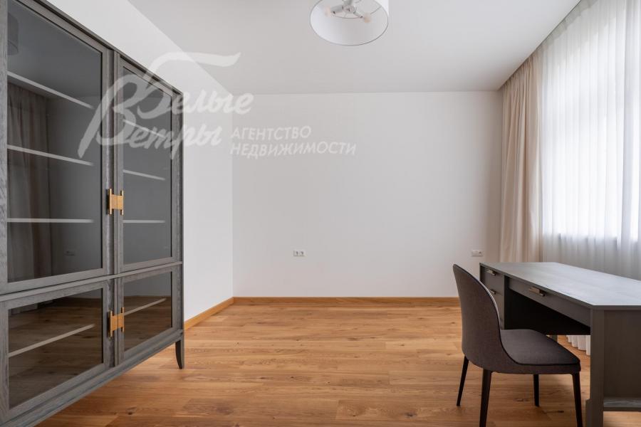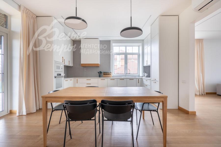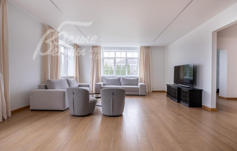 Мебель, оборудование: установлена стильная кухня с белыми матовыми фасадами и каменной столешницей, со встроенной техникой Gorenje (холодильник, индукционная плита, духовой шкаф, посудомойка, СВЧ), чайник. Стиральная машина Hisense с загрузкой 10 кг и стиральная машина Hisense с загрузкой на 9 кг с функцией сушки, пылесос, гладильная доска, утюг, большой телевизор Hisense в гостиной. В гостиной несколько дизайнерских диванов и кресел, в зоне столовой обеденный стол и стулья на 6 персон. В спальнях шкафы, кровати, тумбы, частично мебель (комод, консоль) от фирмы DANTONE, а также от поставщика элитной мебели Home Concept (разных производителей). Во всех помещениях занавески, шторы, светильники, дизайнерские люстры.