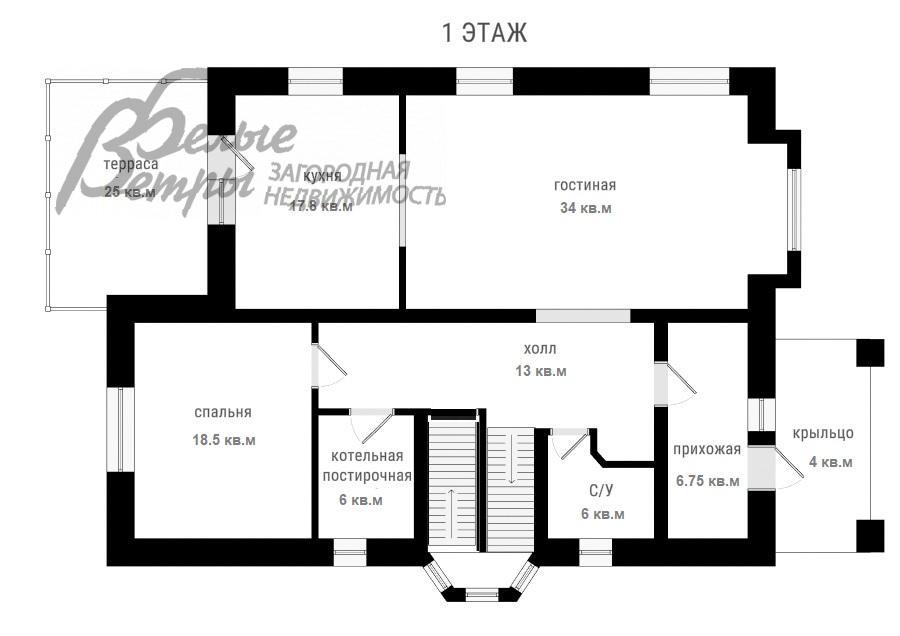 1-ый этаж: прихожая 6.7 кв.м, холл 13 кв.м, гостиная 34 кв.м, кухня 18 кв.м с выходом на крытую веранду 25 кв.м, спальня 18.5 кв.м, санузел 6 кв.м с душевой кабиной, котельная-постирочная 5.7 кв.м