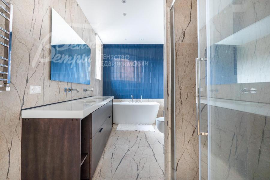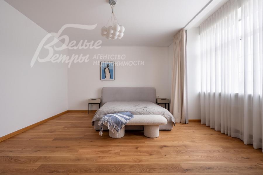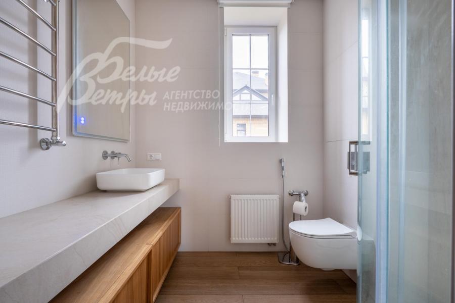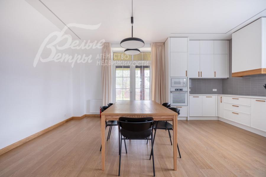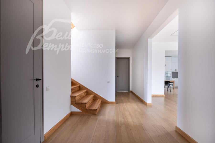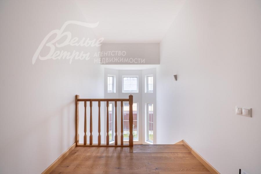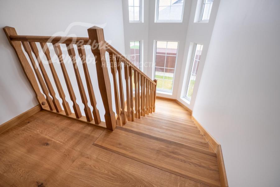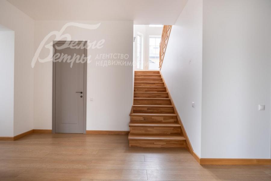 Описание внутренней отделки: качественная отделка в стиле минимализма. Стены окрашены в пастельные тона, на полу паркетная доска или плитка с водяным подогревом. Лестница монолитная, ступени облицованы деревом, поручни деревянные. Двери деревянные, шпонированные. Качественная импортная сантехника ведущих производителей, душевые кабины большого размера. Высота потолков 3.2 м