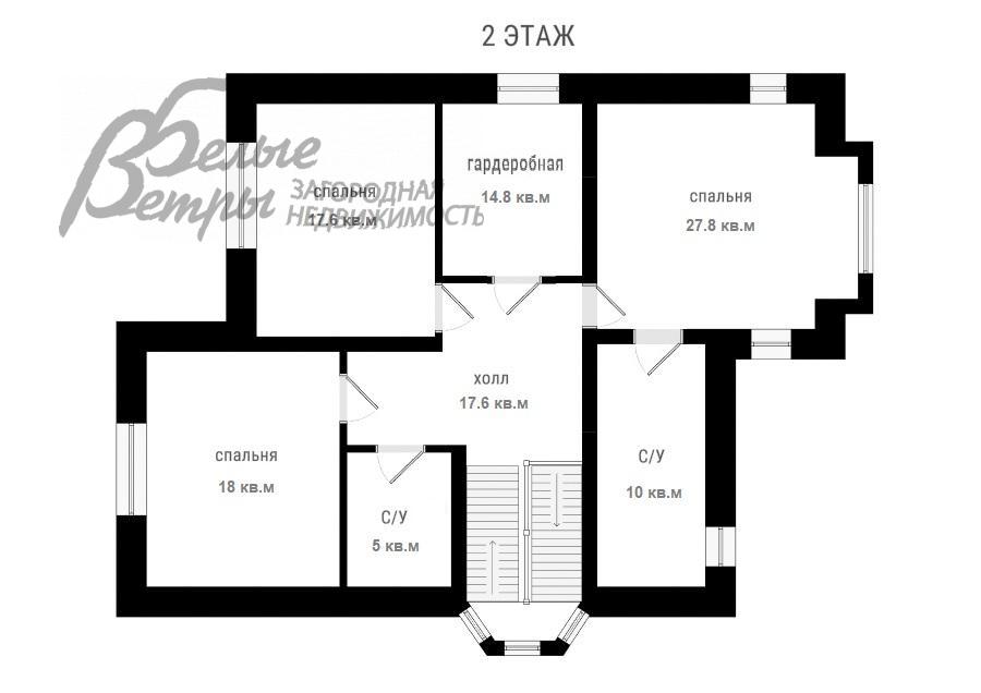 2-ой этаж: холл 17.6 кв.м, главная спальня 28 кв.м с санузлом 10 кв.м (с ванной, душевой кабиной и биде), спальня 18 кв.м, общий санузел 5 кв.м (с душевой кабиной), общая гардеробная 15 кв.м, спальня 18 кв.м